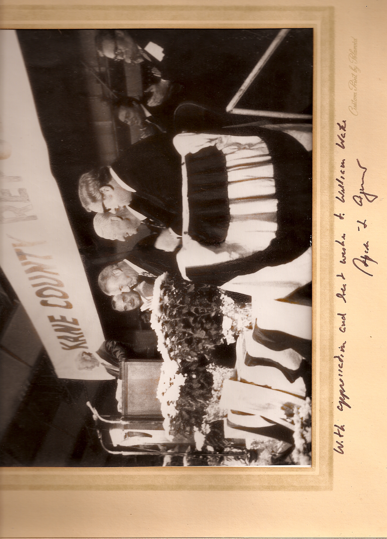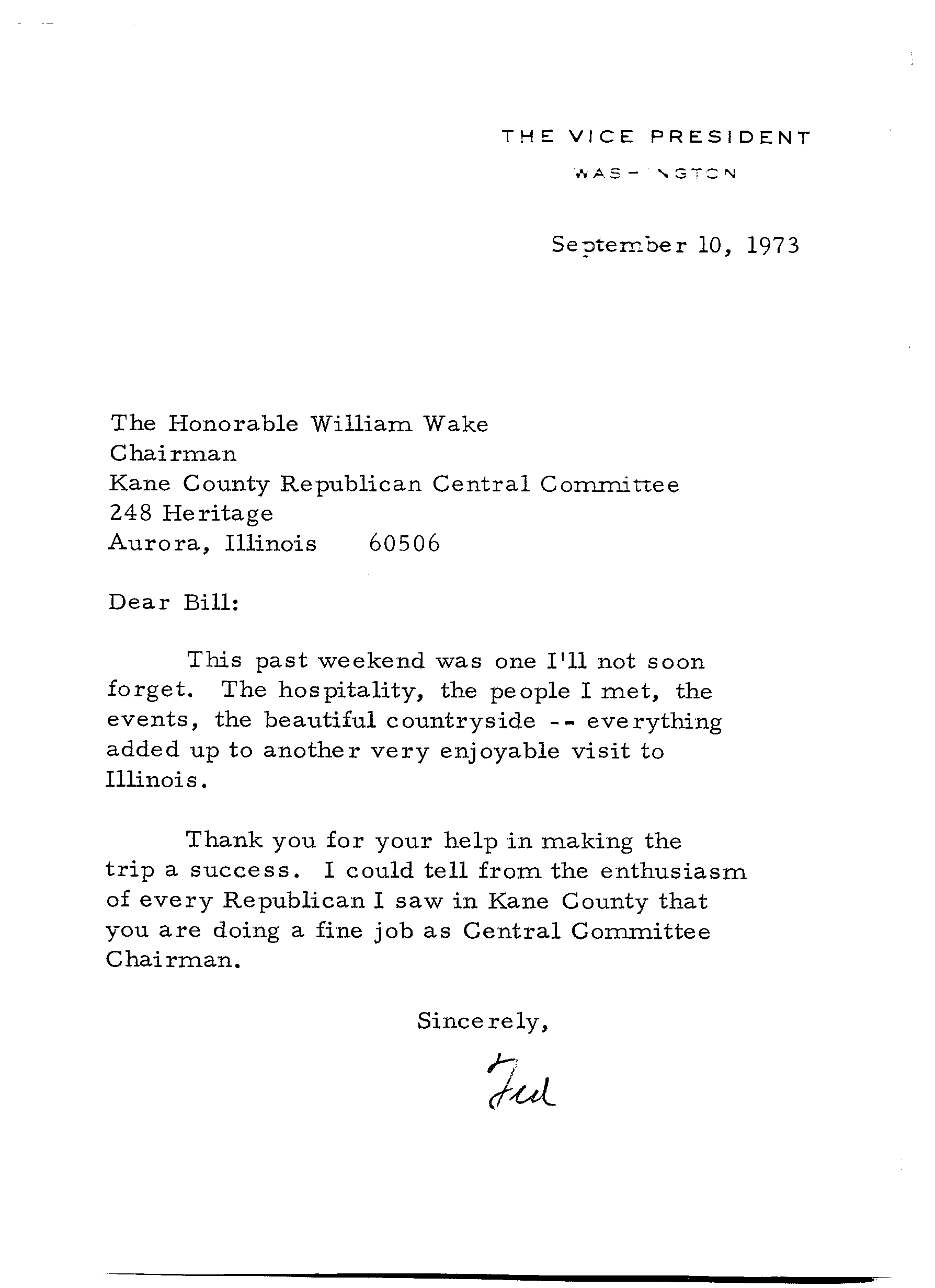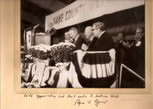 We’re in the midst of basement renovations. Moving boxes out from behind the furnace, my son couldn’t get enough of an unsorted stash of my parents’ photos and memorabilia. He came up with a September 1973 signed thank-you note (boilerplate sentiments typed by a secretary) from then-Vice President Spiro T. Agnew. I’d forgotten about the letter. It goes with the inscribed 8×10 photo which has adorned our fireplace mantle for a while now. My father chaired the Kane County Republicans in the 1970s. Agnew was brought in for a fund-raising speech. (Dad is the guy sitting between Agnew and the podium.) Watergate was in the headlines and Agnew was under indictment in his home state of Maryland for graft. The event was held at the county fair grounds in St. Charles. There was a catered meal, a raffle. Some 2,400 attended. Columnist Joel Weisman, covering the speech for the Chicago Sun-Times, wrote “the vice president is not the same controlled, dynamic speaker he was before his personal grand jury problems became public in August.”