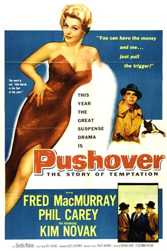 It’s equally tempting to make more of the fact that the role of mobster’s moll Lona McLane is played by 21-year-old Kim Novak in her film debut. The character, unfortunately, is underwritten with murky motivations. She’s eager to ditch her bank robbing boyfriend, but we’re never convinced that she could inhabit such a world to begin with, much less lure MacMurray into double-crossing the boyfriend and grabbing his loot. A reluctant femme fatale, in other words, curiously upstaged by the more recognizably “good” woman in the film played with confidence and sensuality by Dorothy Malone. Novak hadn’t yet figured out how to make her passivity alluring and mysterious and maddeningly erotic to the collective male psyche. Hitchcock’s Vertigo was four years in the future, as was Bell, Book and Candle (directed by Pushover’s Richard Quine).